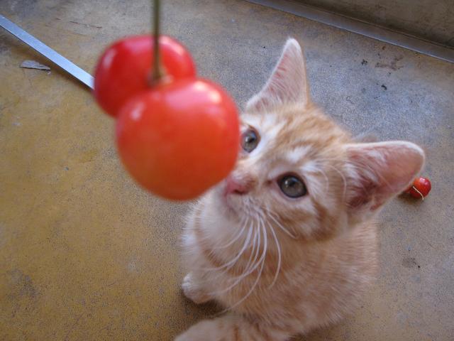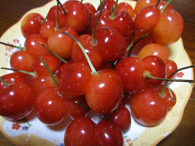 1本の軸に2個の実がくっ付いた売り物にならない双子のさくらんぼをいただきました。