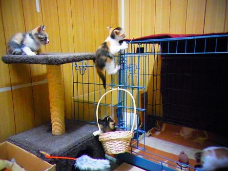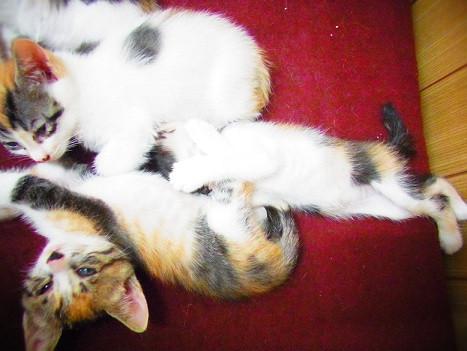 右端で、ごはんに飛びつく白三毛ちゃんのお尻が。(*≧m≦*)見えてますよ♪