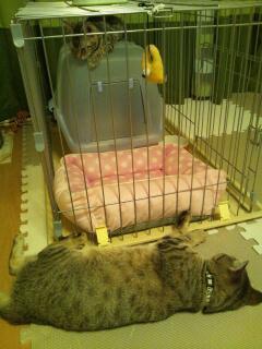ワタシの夕ごはんの時、ニコちゃんはケージに入ってたんですが、すぐ近くでドラくんがウトウト。