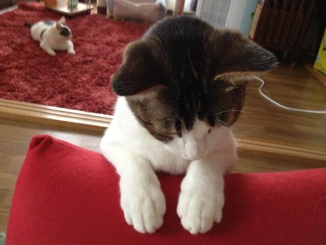 続いて、お腹が空いてニャーニャー催促しても、まだ時間じゃないからね!(^ω^)と私に言われてしまい、一旦引き下がったけれども、お腹は空いたままのマルさん(。-_-。)