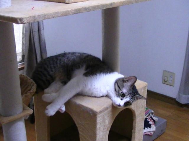 キャットタワーで寝そべっていました(^^)