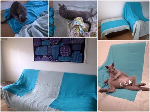 冬の間はプードルファーで作ったカバー、春の間は青耳リネンで作ったカバーにしてましたが、夏になったのでさらっとしたインド綿で(さんざん邪魔されながら)作ってみました☆