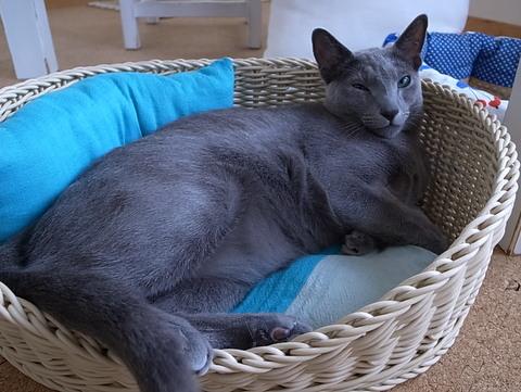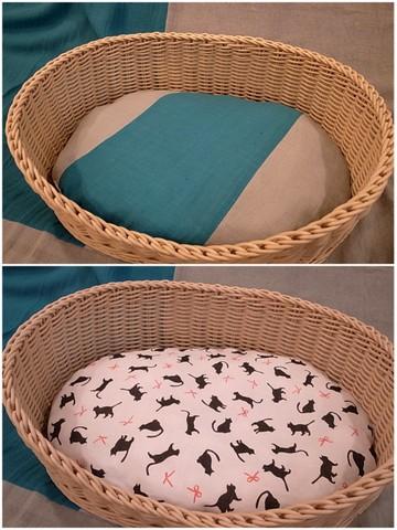 猫ベッドも夏仕様にしてみようと思い、ソファカバーを作った時に余った端切れを縫い合わせてクッションを作りカゴベッドにINしました^^