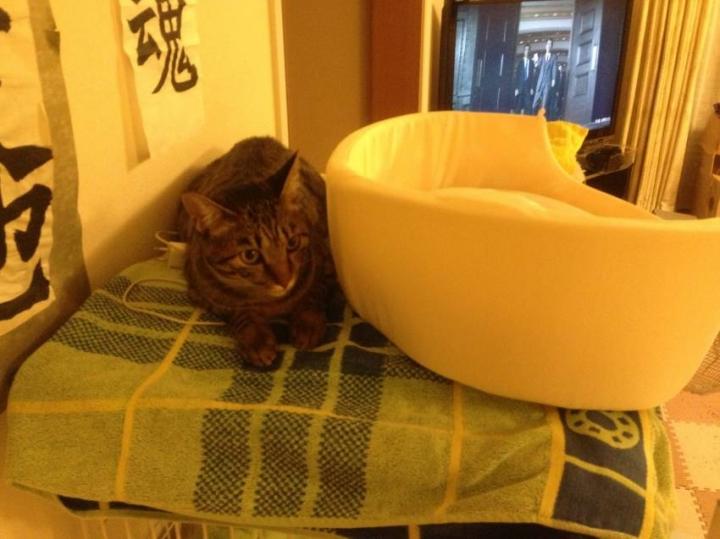 たまにケージの上でくつろぐことがあるので、そこに置いてみた。