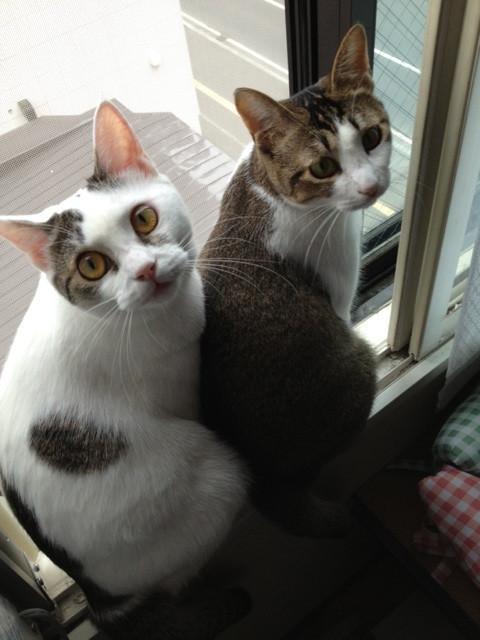 次は今朝、カラスの大きな鳴き声になんだニャーで、窓に張り付きの2にゃん(⌒▽⌒)