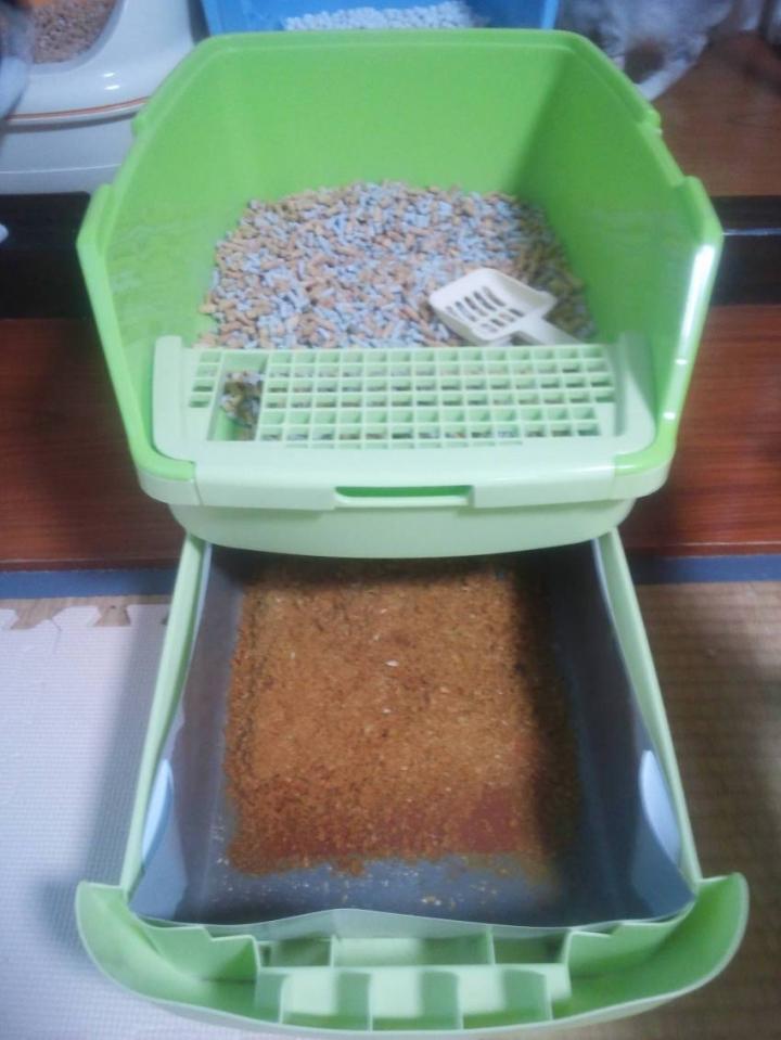 純正のペレット(おしっこがかかったら粉になって下に落ちるタイプ)と香り付きのものをミックスで使用中。
