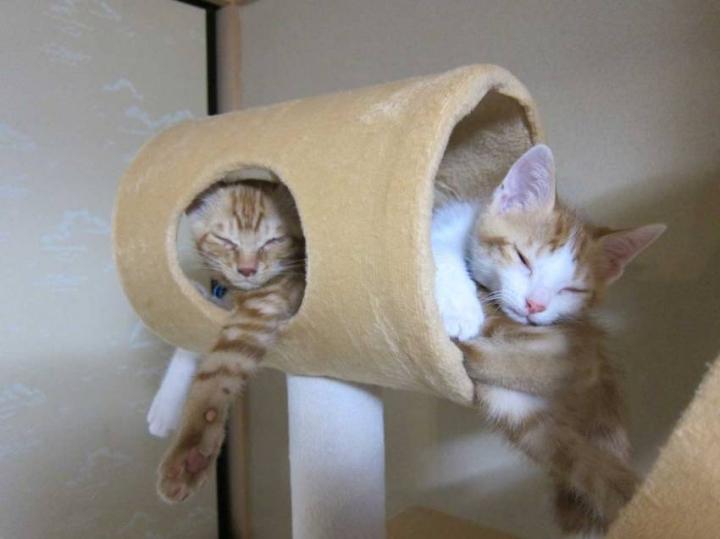 色々ふかふかの場所は用意してあげてるんだけど、気がつくとキャットタワー中段の円柱で重なって寝ている。高くて狭いというのがポイントなんだろうか…。