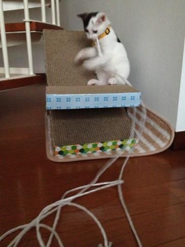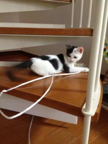 階段まで持ってって、躍動するヒモに大はしゃぎ