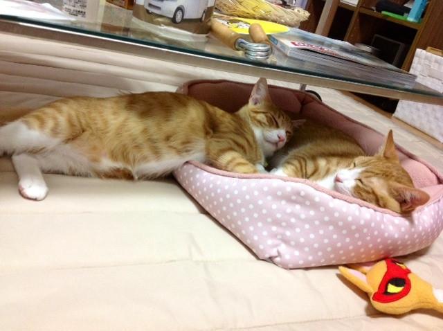 恐怖で、大変な一日でしたが、何もなかった様に、猫ベットに、