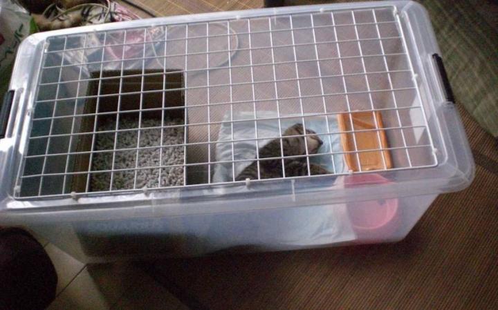 今ある普通のケージでは子猫がすり抜けるので、苦肉の策で作ってみました。