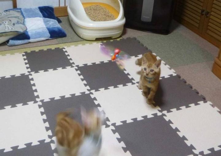 ワイヤーの先にトンボのようなおもちゃが付いた猫じゃらしを買いました。これはオススメ!指先でくるくるひねると、カシャカシャと音を立てて、かなりトリッキーな動きをします。まるで本当の昆虫が飛んでるようで、猫達大興奮!