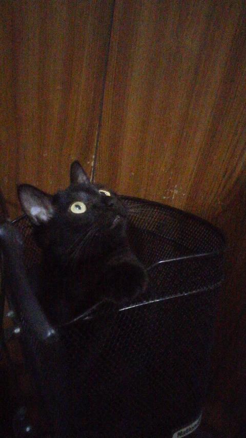 ユウタが玄関の自転車のカゴの中で待ってました。