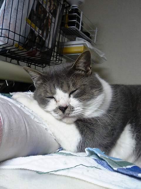 で、あいている方の枕を使って私も寝るんですが、そうすると待っていたかのように、私のほっぺたを舌で「ゾリゾリ」となめるんです。「お前は犬か!」「そういやポチだもんな~」ハッキリ言って君の舌は痛い!頼むから熟睡しているときはなめないでくれ~と言っているうちに、外が明るくなり始める。この時期は睡眠不足でつらいです。