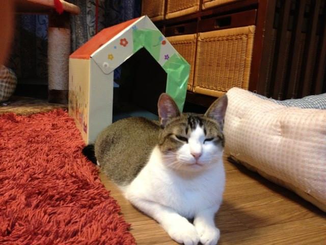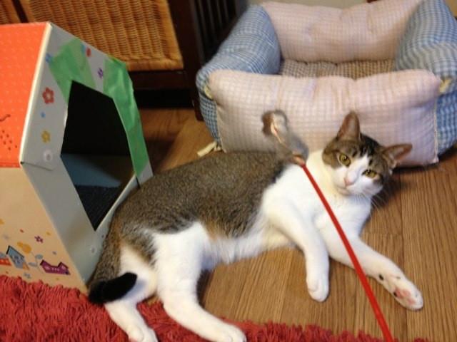 じゃらしを狙って澄ましてますが、後ろの、爪研ぎハウス、緑色のテープで補強してますよね(;^_^A