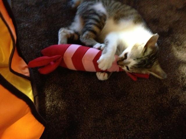 今日、楽◯で買った新しいおもちゃで遊んでます(=^x^=)