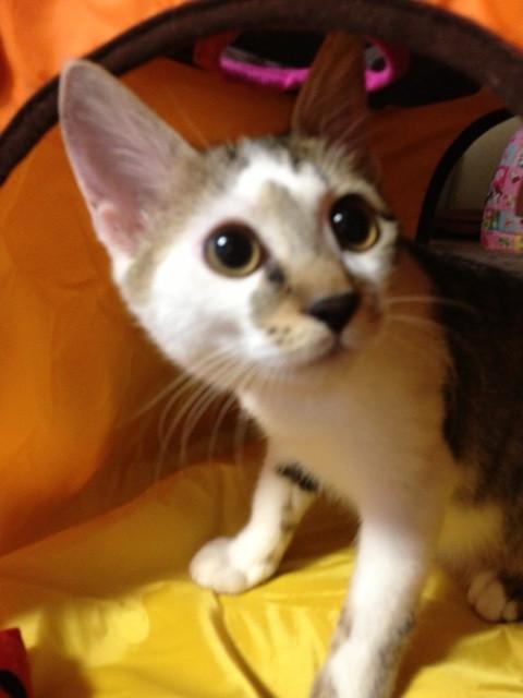 ランちゃんと同じ位の大きさの、抱きキックおもちゃに、最初はビビリまくりで、近づけると、ぴょんど逃げて、興味深々でまた、近づく。近づけると逃げる( ̄▽ ̄) 笑えました(笑)