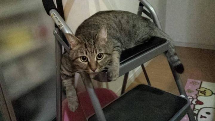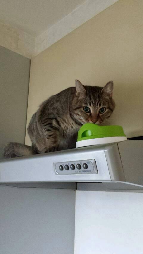 ドラくんはゴハンを少し残して後で食べることがありますが、すかさずニコちゃんが横取りしようとするので、残りをレンジフードの上に上げたら…自分が登って食べてました。