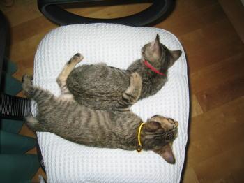 お揃いの首輪にしたら「ゆず」・「あんず」の区別が難しかったので、「ゆず」は黄色の鈴で黄色のリボン、「あんず」は赤い鈴で赤いリボンにしました。