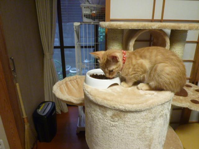 犬のジュンにエサを食べられちゃうのでななのキャットタワーの上にエサを置いてみました。