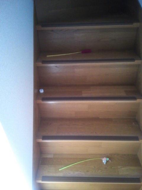 わかりますか?階段にジャラシが2つと、ペットボトルのフタ!