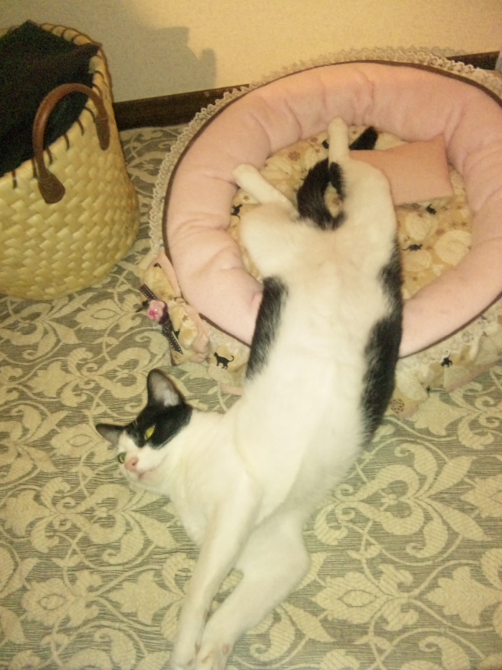 最近の寝姿はもうおなかを出して万歳ポーズ。