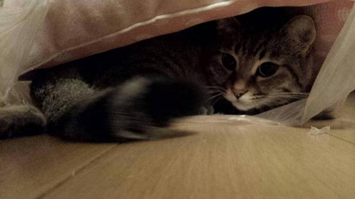 ボロボロで処分するベッドの下に入り込むニコちゃん。