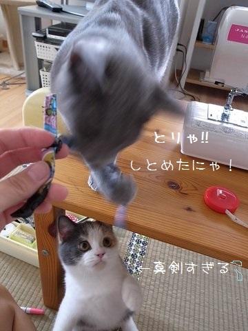 布を裁断したときから興味津々でしたが、リボン状になったらもう我慢できなくなったようで、取り合い(;´Д`A ```