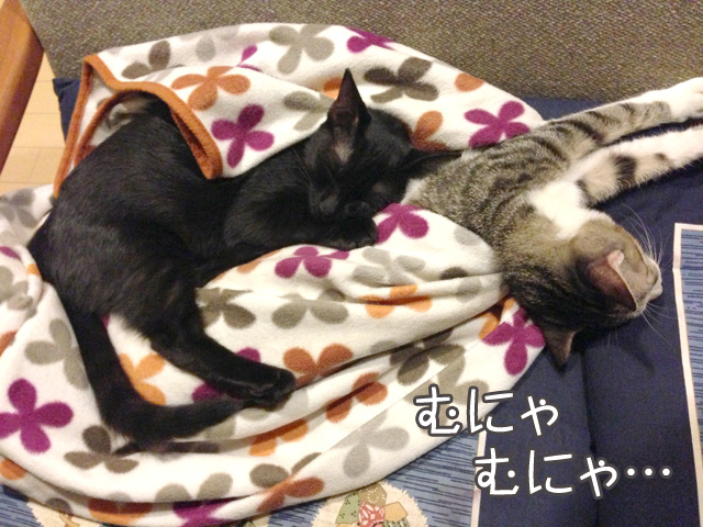 ネコちゃんたちにもいつもの寝床に「ひざ掛け」を置いてあげたら