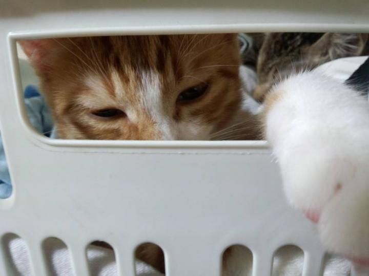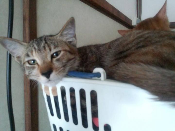 相も変わらずきなこちゃんは、まだまだお子ちゃまのようでかごの洗濯物の上で喉を慣らしながら遊んでました(笑)