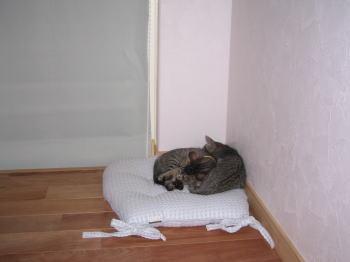 ニャン様が朝の運動後、階段の踊り場で寝たのを発見した爺やが、陽がまぶしいだろうとカーテンを下ろし、寝難いだろうとクッションを敷いて差し上げておりました。