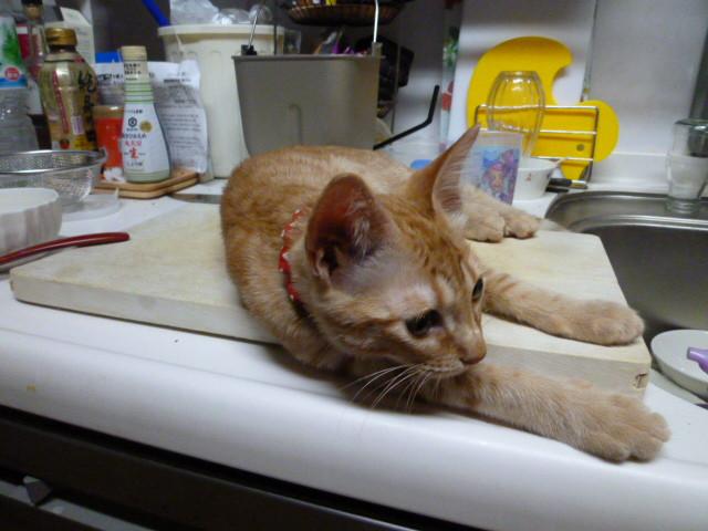 このごろシンクに上れるようになって危ないのですぐに降ろすのですが、なんとまな板の上で寝そべり始めたのでした。