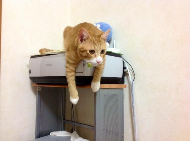 アキくん!始めてプリンターの上に、上がったけれど降りれません!!