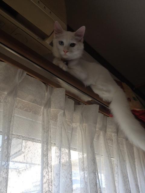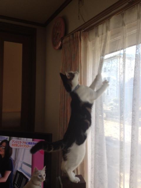 レースのカーテンに爪をひっかけて、器用に登っていきます。