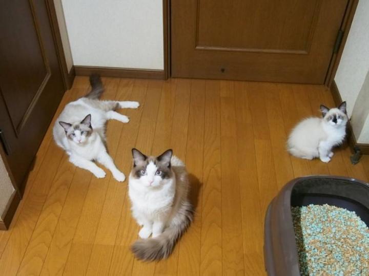 あまり3ニャンで同じ場所に居る事が少ないのですが、少し離れていますがかろうじて、皆一緒のところを撮る事が出来ました。