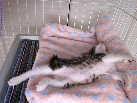 虎王もケージの扉を開放したままで寝床に置いたら、脱走することなくお昼寝となります。