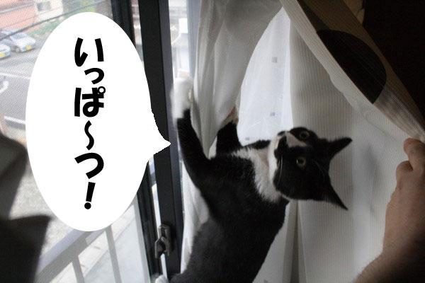 踏み台(私の背中)なしでカーテンレールの頂上に到達できるよう猛特訓中のコポリさん。