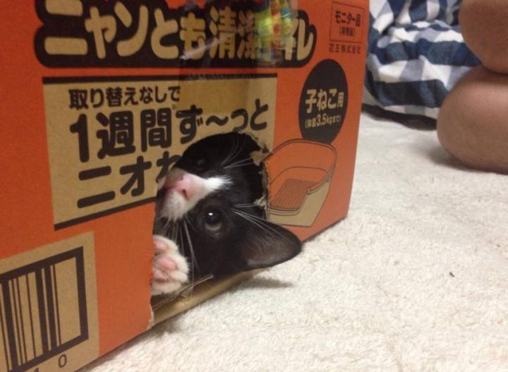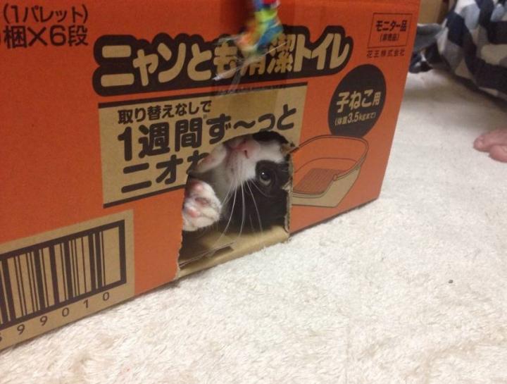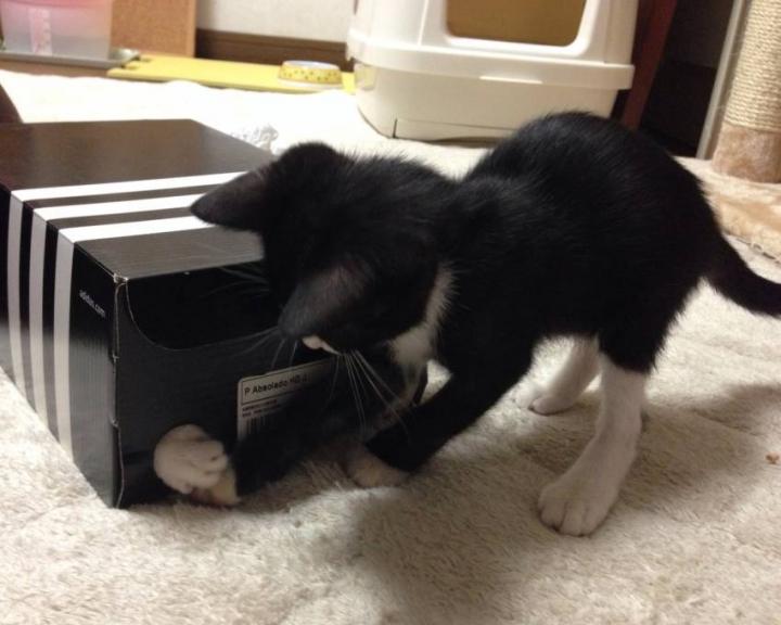 ダンボールに穴を開けただけですが、これがまたタキシード兄弟には大ウケ。