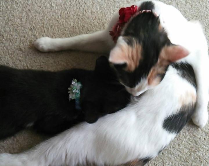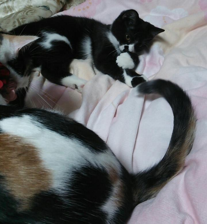 シッポで遊んであげたり、一緒にお風呂場から外を眺めたり、ナメナメしたり、追い掛けっこしたり、ニャンズは毎日楽しそうです。