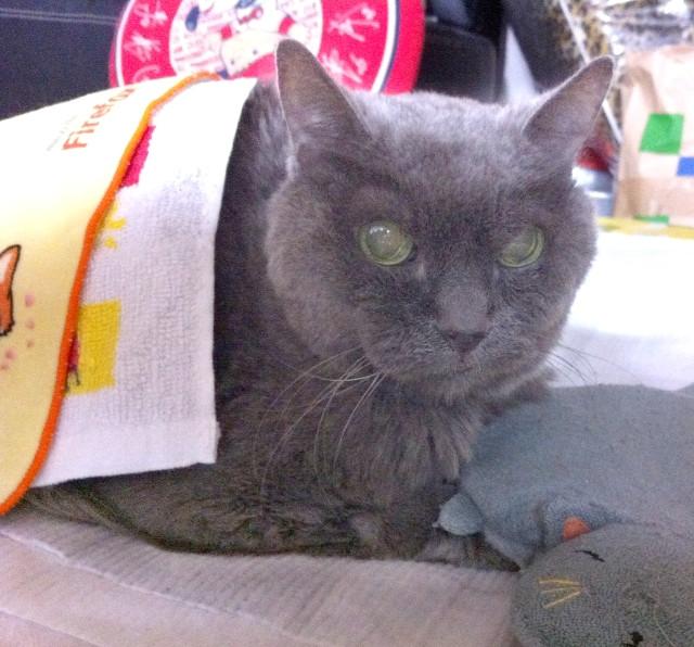 ※写真は…ワタシの体がパンパン過ぎて、マミが呼ぶところのお布団(タオルハンカチ)がお布団でなくなってるの(自分の力で香箱組めたのは、これが最後にニャってしまった)。