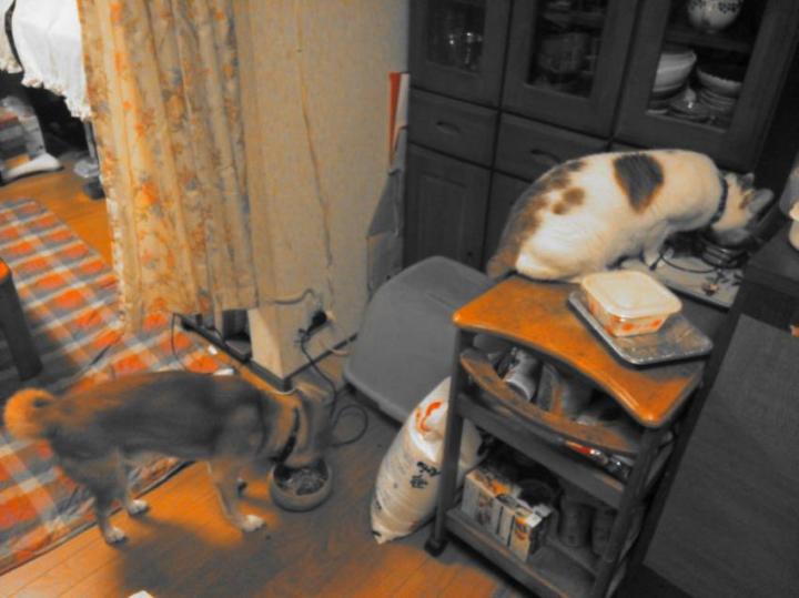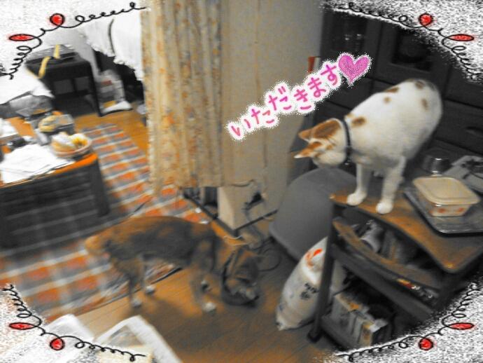 お風呂場からこっそり様子を伺って、サチが去った隙にまんまとシニア犬用ご飯をget!