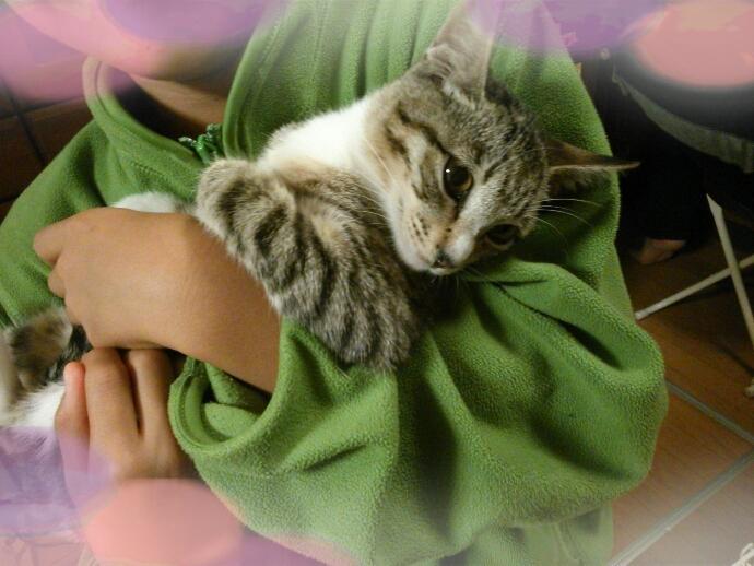 生後3ヶ月のシーラちゃんは、募集中の写真よりも実際は幼くて、とっても大人しく人なつっこい猫ちゃん。一緒に行った息子も、「カワイイねー♪」と一目惚れ。