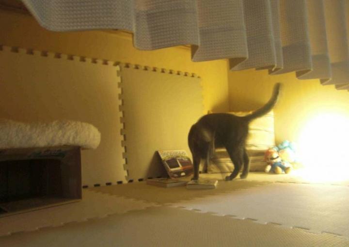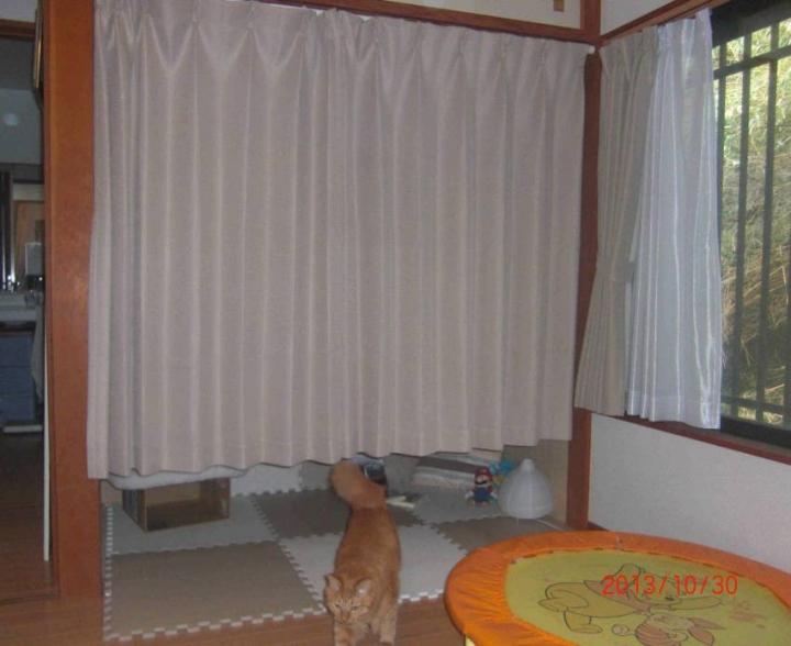 ママさん大工レベルのわたくしは、突っ張り棒を使って、押し入れにカーテンをかけることに・・・。防虫防かびシートを敷いてからベビー用のプレイマットを敷きました。