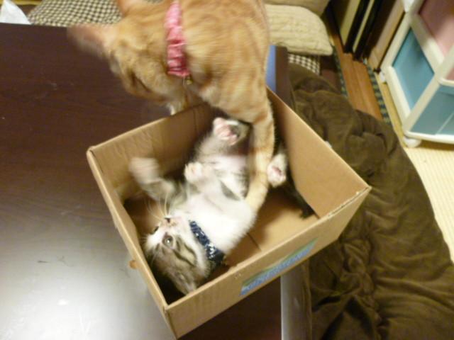この前の日記でななが入っていた箱にそらが入ったらななが慌てて追い出します(>_<;)