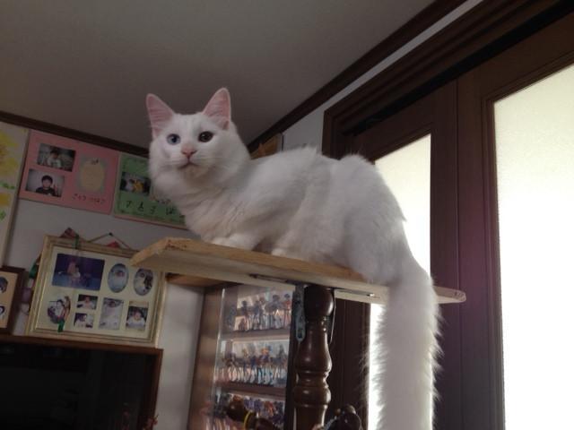 朝はゆっくりキャットタワーの最上階でくつろいで、自慢のしっぽをだらーんとさせてました(笑