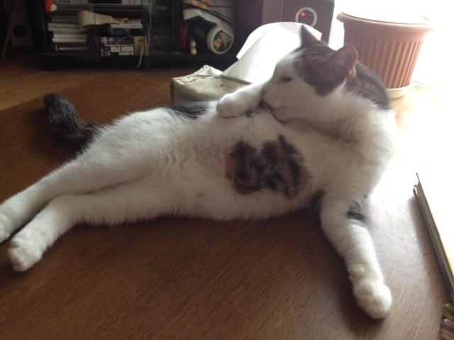今日の締めは、マロの変なポーズの毛づくろいです。