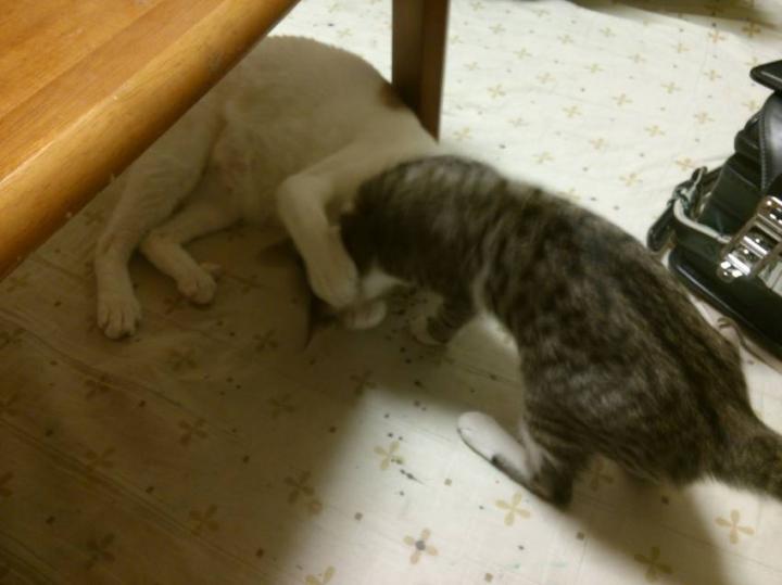 サチは新入り猫ちゃん三度目で経験豊富なんで全然動じず、流石ベテランさん!なのですが、トムはピュッと立ち退いちゃいます。動くのめんどくさい時は写メみたいに顔がソッポ向いちゃってるし。(-_-;)