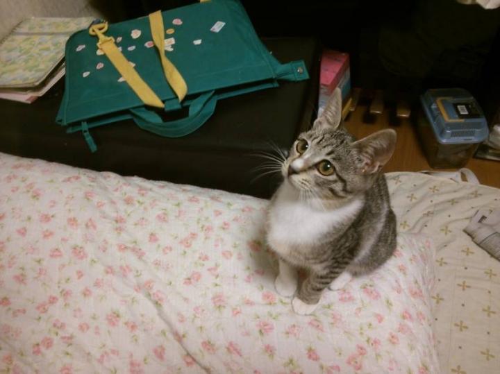 最近は息子のベッドの上がお気に入りで、見当たらないのでどこ行ったかな~と思って探すと、大抵そこで寝ています。