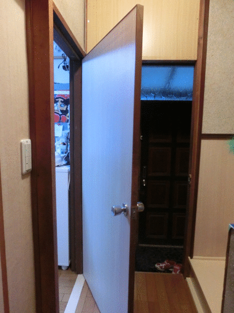 次の写真は妹宅の玄関から廊下に上がったところです。玄関を入ると直ぐにキッチンが有ります。この扉は(写真1枚目)本来キッチンの物なのですがサイズがちょうど良かったために上手く利用して玄関の脱走防止扉に使っています。上から飛び越えられたら困るので扉上部には板を貼りました。玄関が二重扉になっている様な感じです。(写真2枚目)