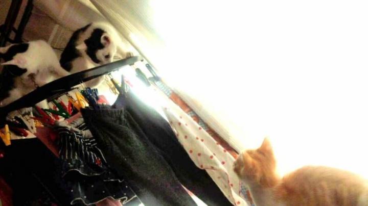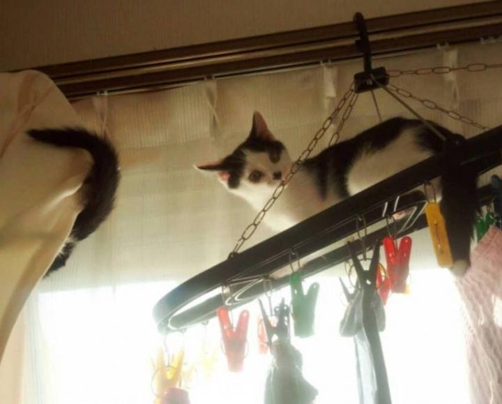 角ハンガーに一匹と、カーテンの裏からしっぽ!