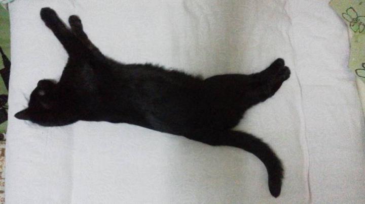 もうちょっと辛抱すると布団から出て枕の上に移動するんだけどね。